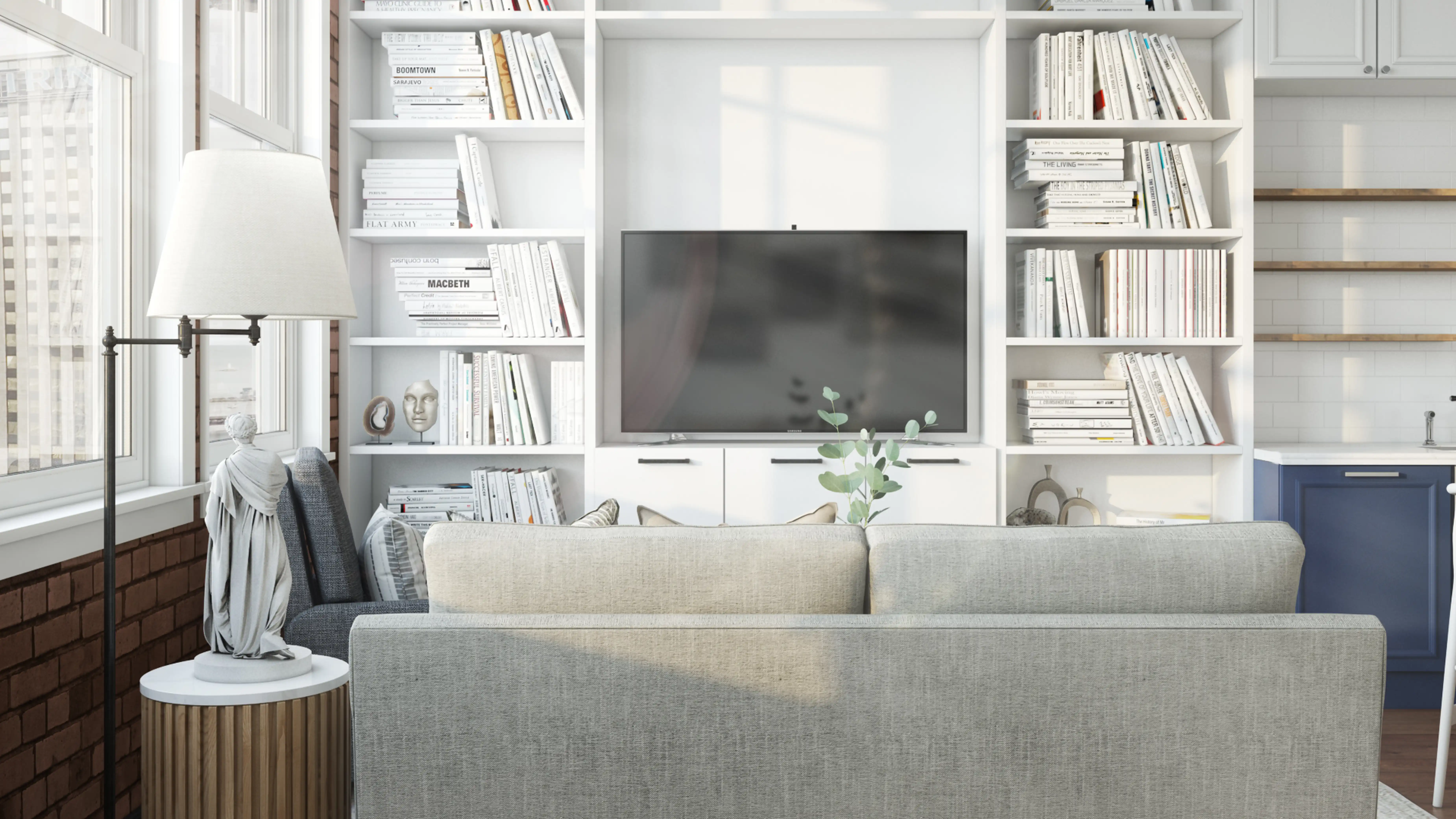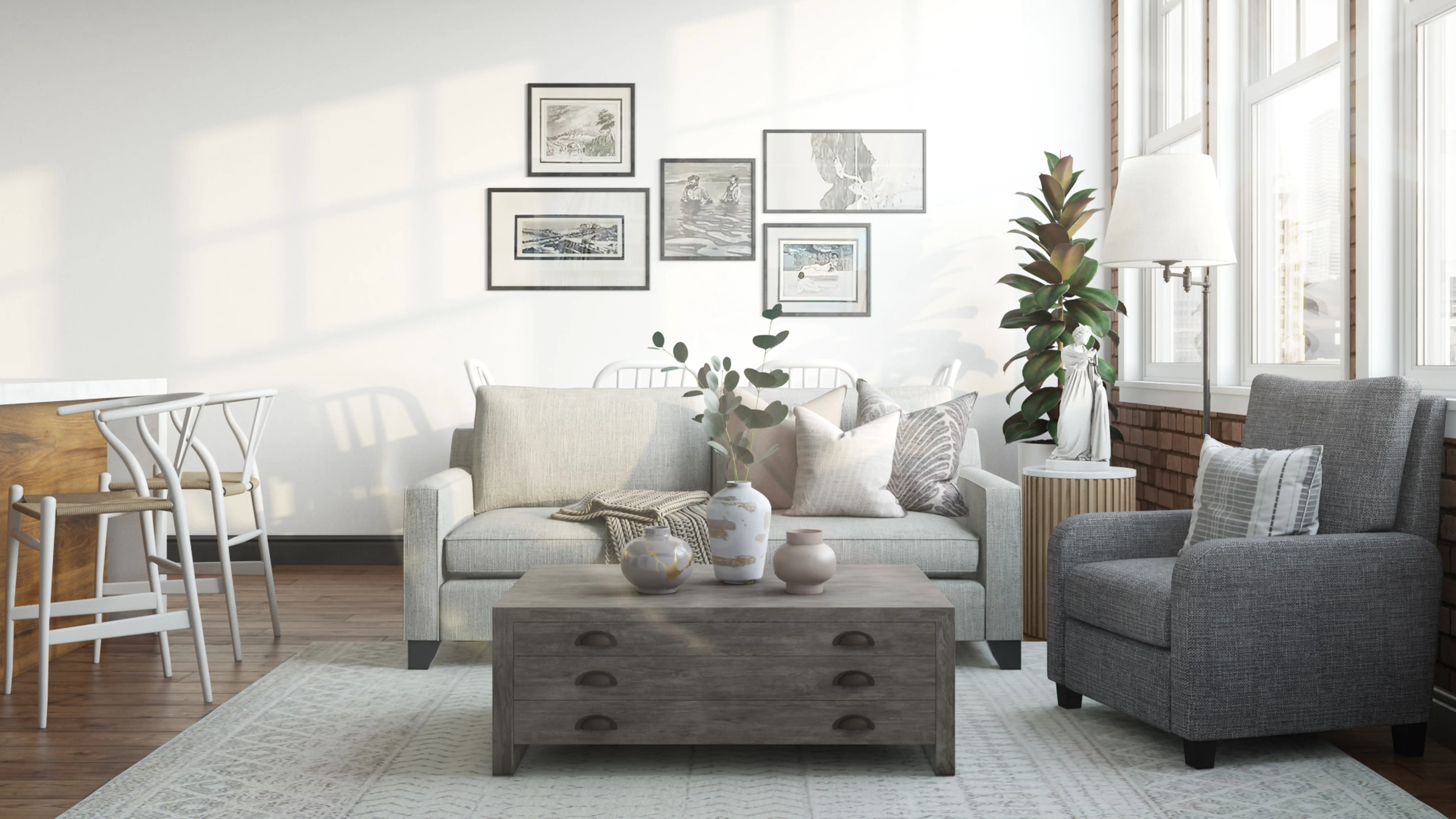 For this room, Natalie selected sofas, table, and bar stools from Crate, Barrel, and Pottery Barn. Discover Furniture design inspiration on Havenly.