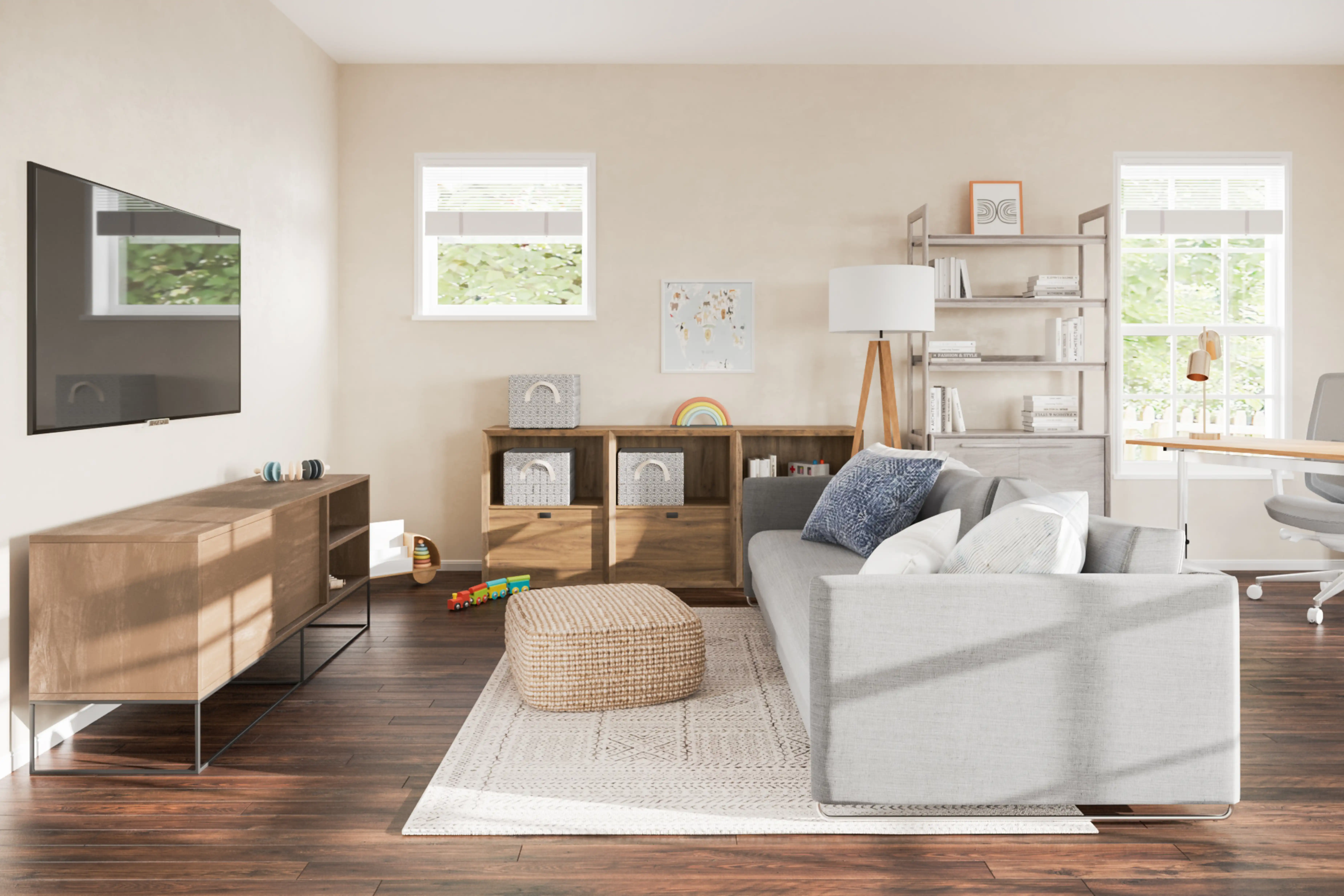 For this Living Room, Laura selected bookcases, standing shelves, and outdoor sofas from Crate, Kids, and CB2. Discover Furniture design inspiration on Havenly.