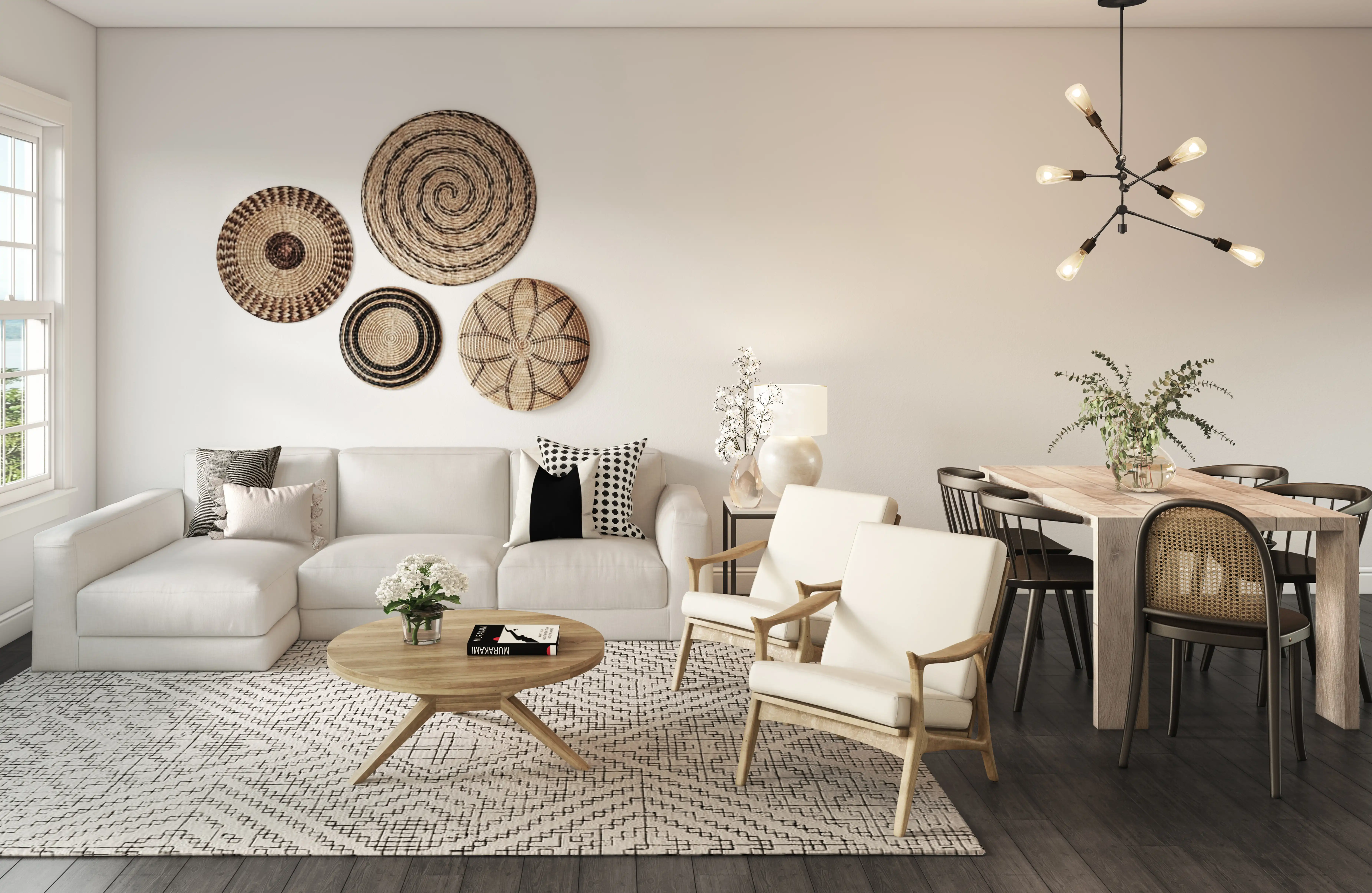 This minimal living room design favors function over form and perfectly combines relaxing and dining space. The wood tables and woven wall art add a rustic feel to the room. The black dining chairs add some contrast to the neutral color palette.