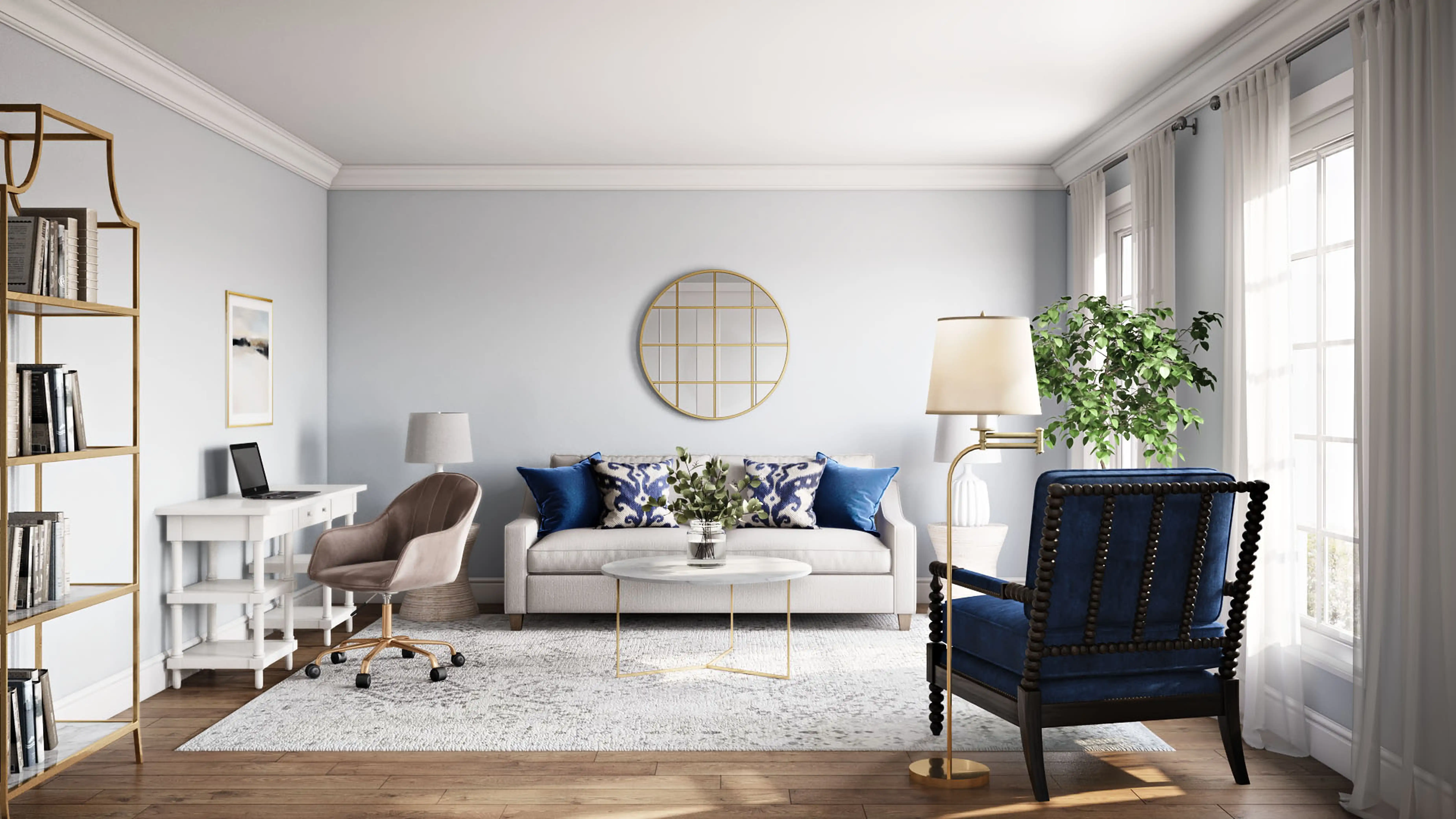 This Transitional living room features a refined design. The classic white sofa is layered with blue decorative pillows. The marble coffee table, gold bookshelf, gold accent mirror, and lamp add glam vibes to the room.