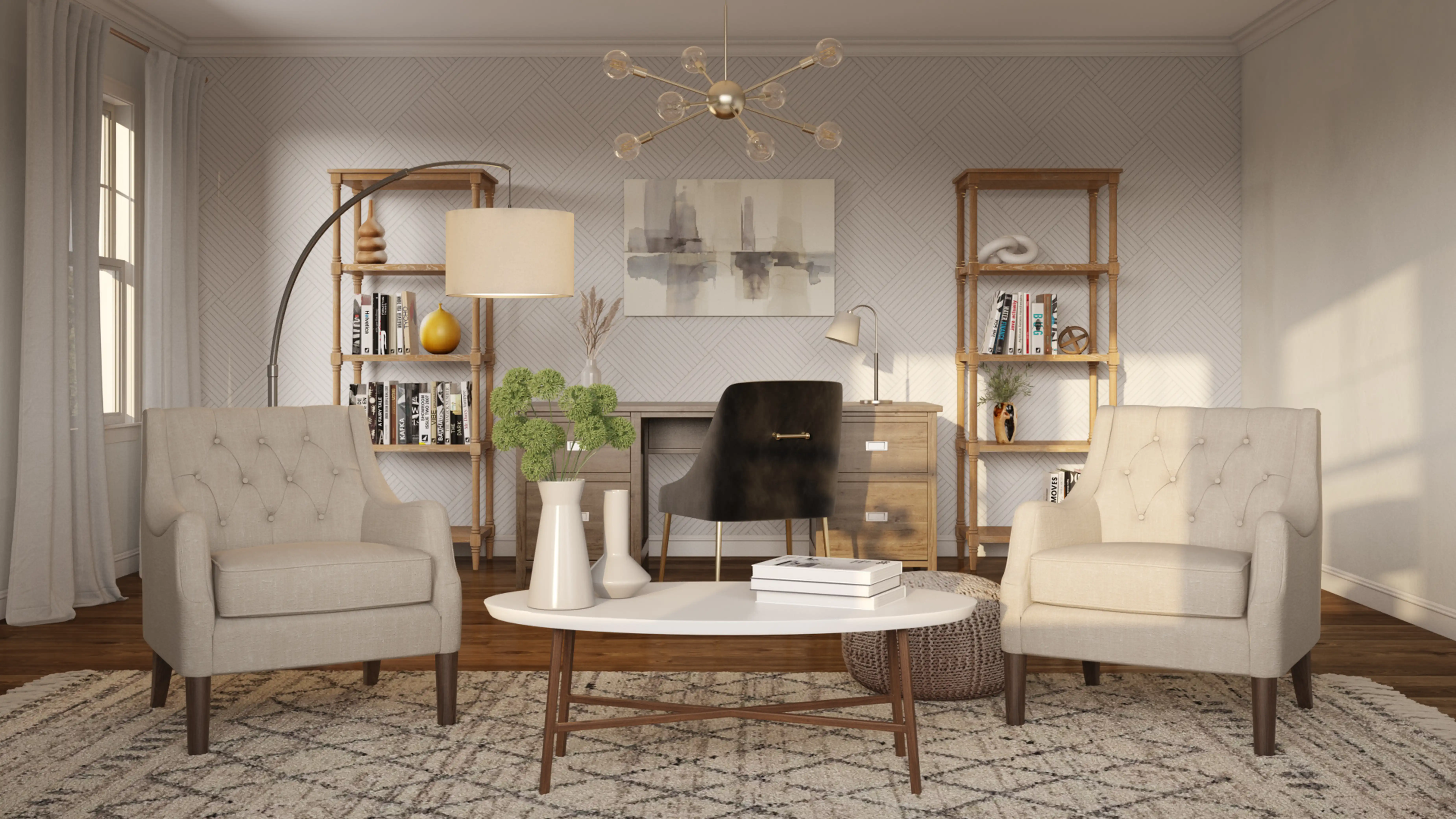 For this Office, Kayla selected desks, bookcases, and standing shelves from Crate, Barrel, and Safavieh. Discover Furniture design inspiration on Havenly.