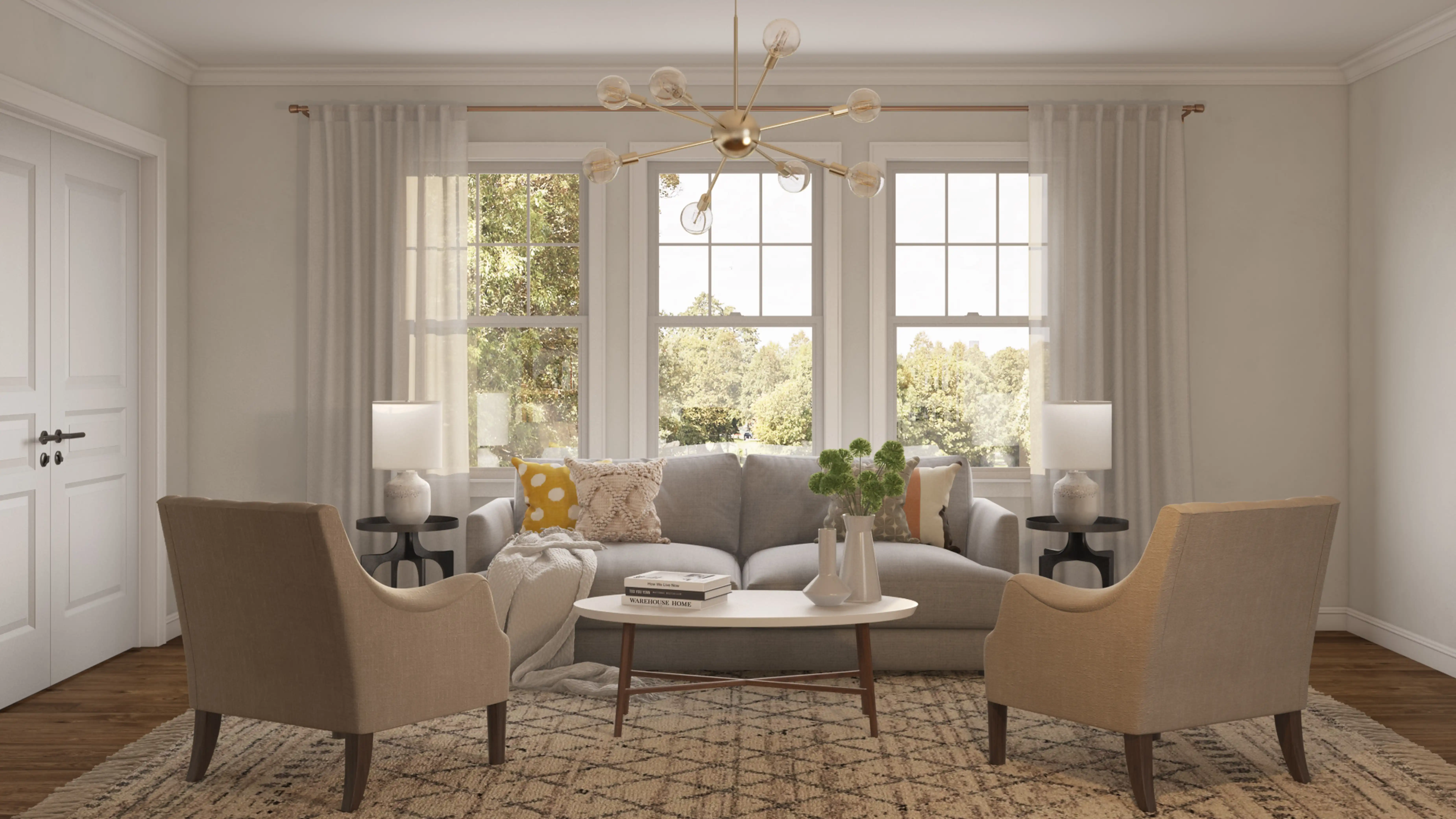 To brighten the design, Midcentury Modern ceiling light fixtures and lamps were added to the room. Discover Lighting design inspiration on Havenly.